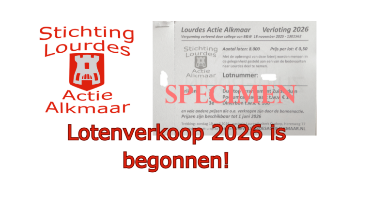 De jaarlijkse verkoop van loten voor de Stichting Lourdes Actie Alkmaar is begonnen. Een boekje met 25 loten kost € 12,50, één lot kost € 0,50. De loten kunt u nu al kopen, u hoeft niet te wachten tot het weekend van 18 en 19 april.